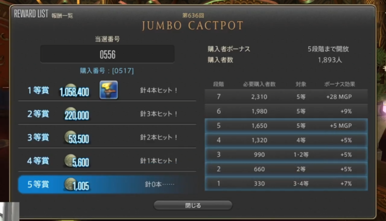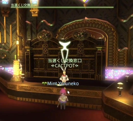 景品の引き換えは、ゴールドソーサー にいるNPC“当選くじ交換窓口 (X:8.6 Y:5.7)”で1枚づつ交換が可能となっています。
