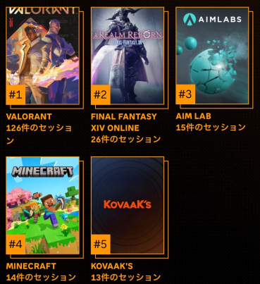 自分の場合ずっとやっているFPSのVALORANTが大半を占めていて、今年のセールでかったFF14を起点として二番となり、エイム練習のAim LABとKovaak’sが3位と5位にランクインしています。